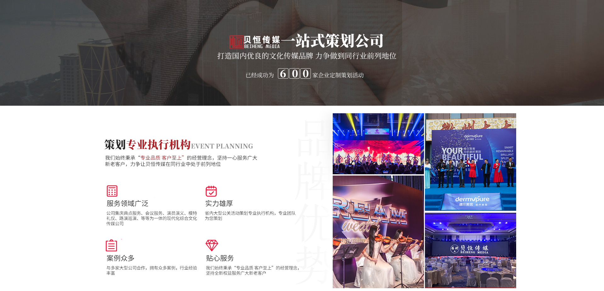 - 合 肥 貝 恒 文 化 傳 媒 專注·專業(yè)·專心·效率 合肥貝恒文化傳媒有限公司2017年成立于安徽·合肥,是省內大型公關活動策劃專業(yè)執(zhí)行機構,公司集慶典服務、會議服務、演員演藝、模特禮儀、路演巡演、展會特裝、廣告制作、設備租賃、舞美策劃、企業(yè)形象宣傳等為一體的現(xiàn)代化綜合文化傳媒公司,我們始終秉承“專業(yè)品質客戶至上”的經營理念,堅持全...